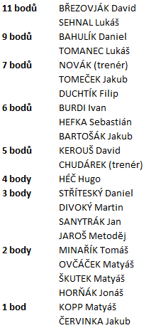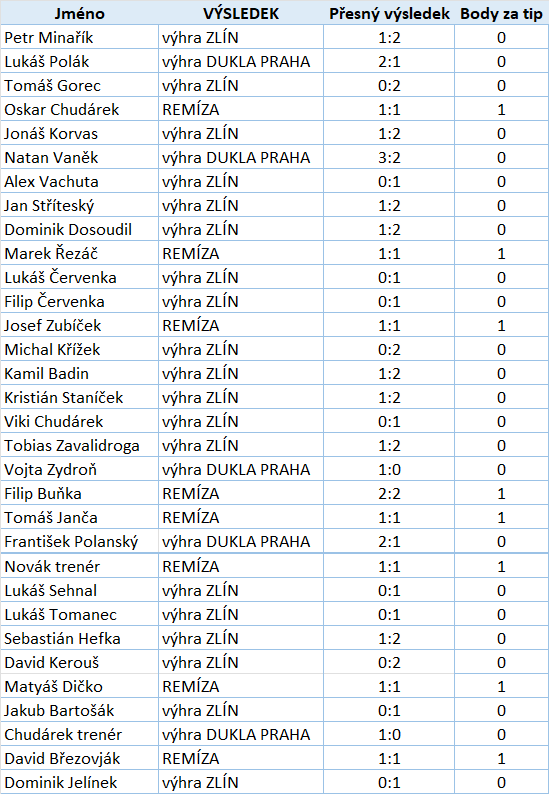 Pozn. správný výsledek (domácí / remíza / hosté) = 1 bod, správný přesný výsledek (konečné skóre) = 2 body