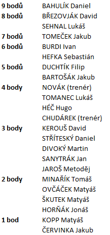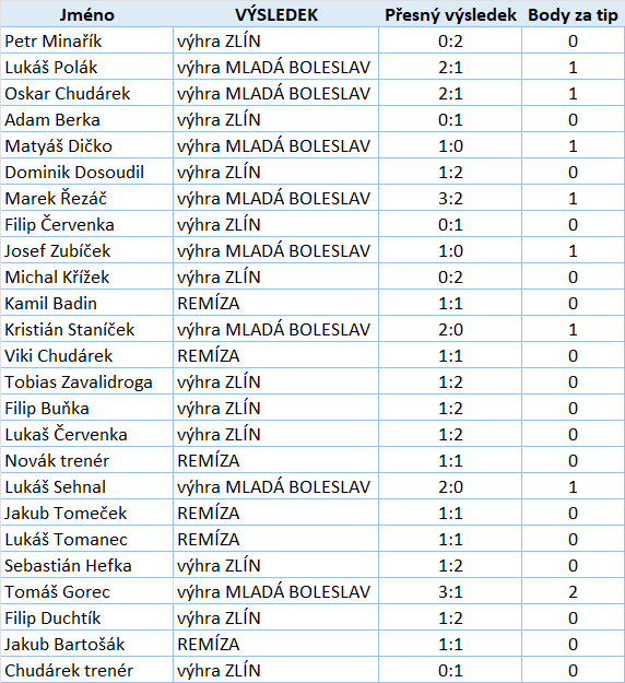 Pozn. správný výsledek (domácí / remíza / hosté) = 1 bod, správný přesný výsledek (konečné skóre) = 2 body